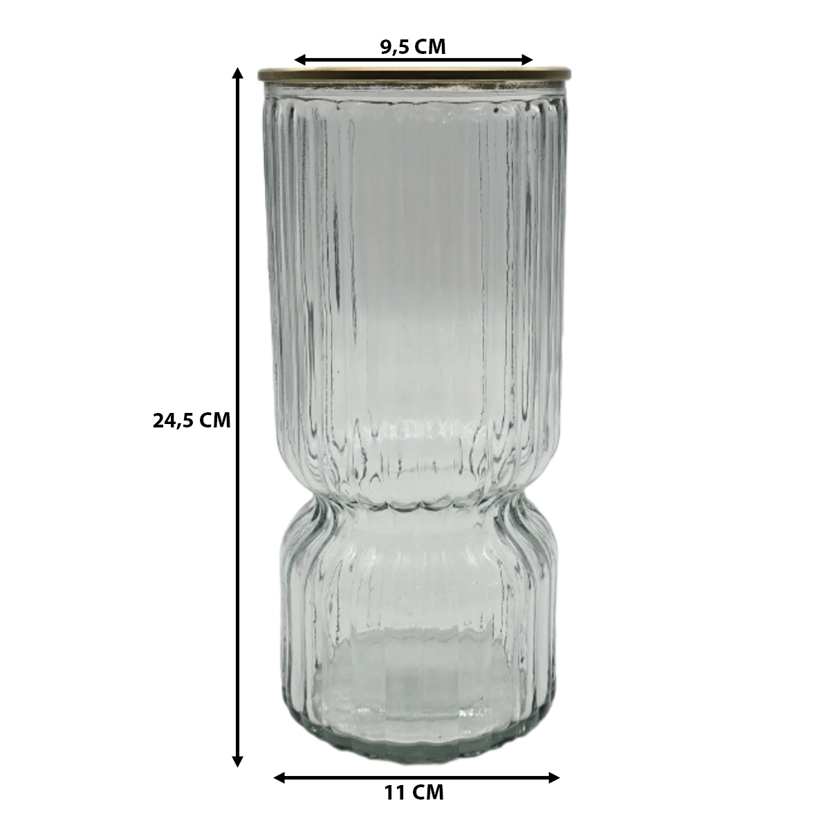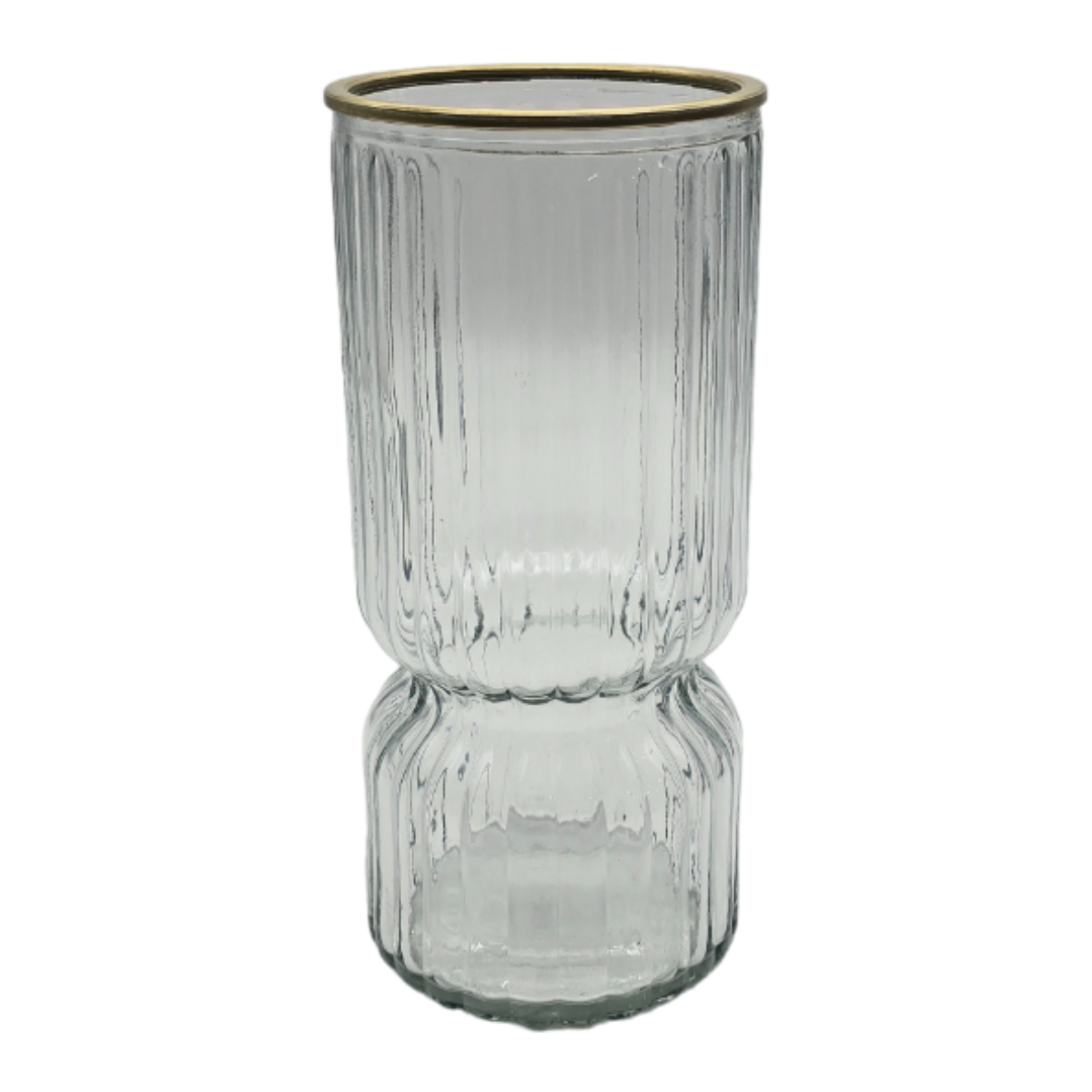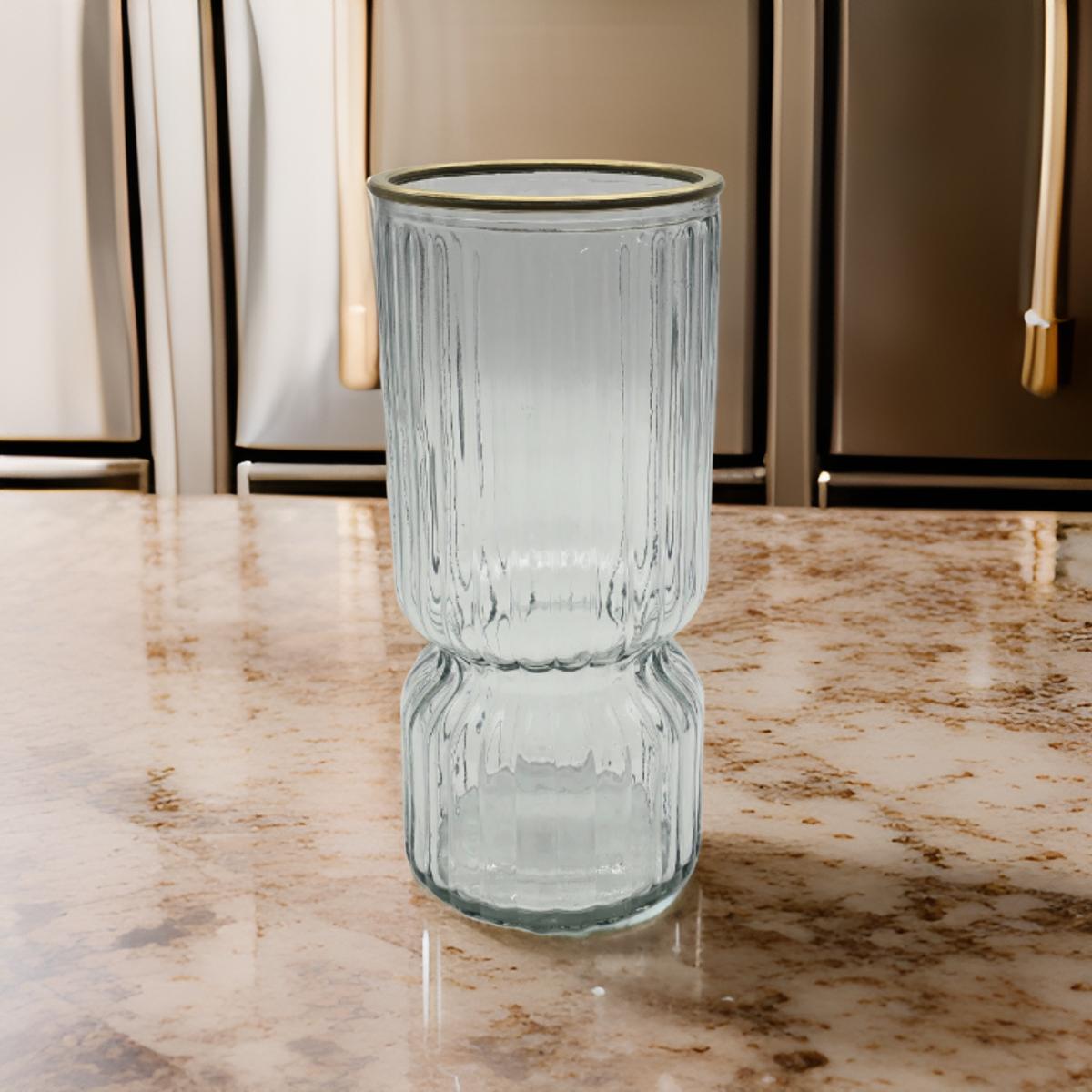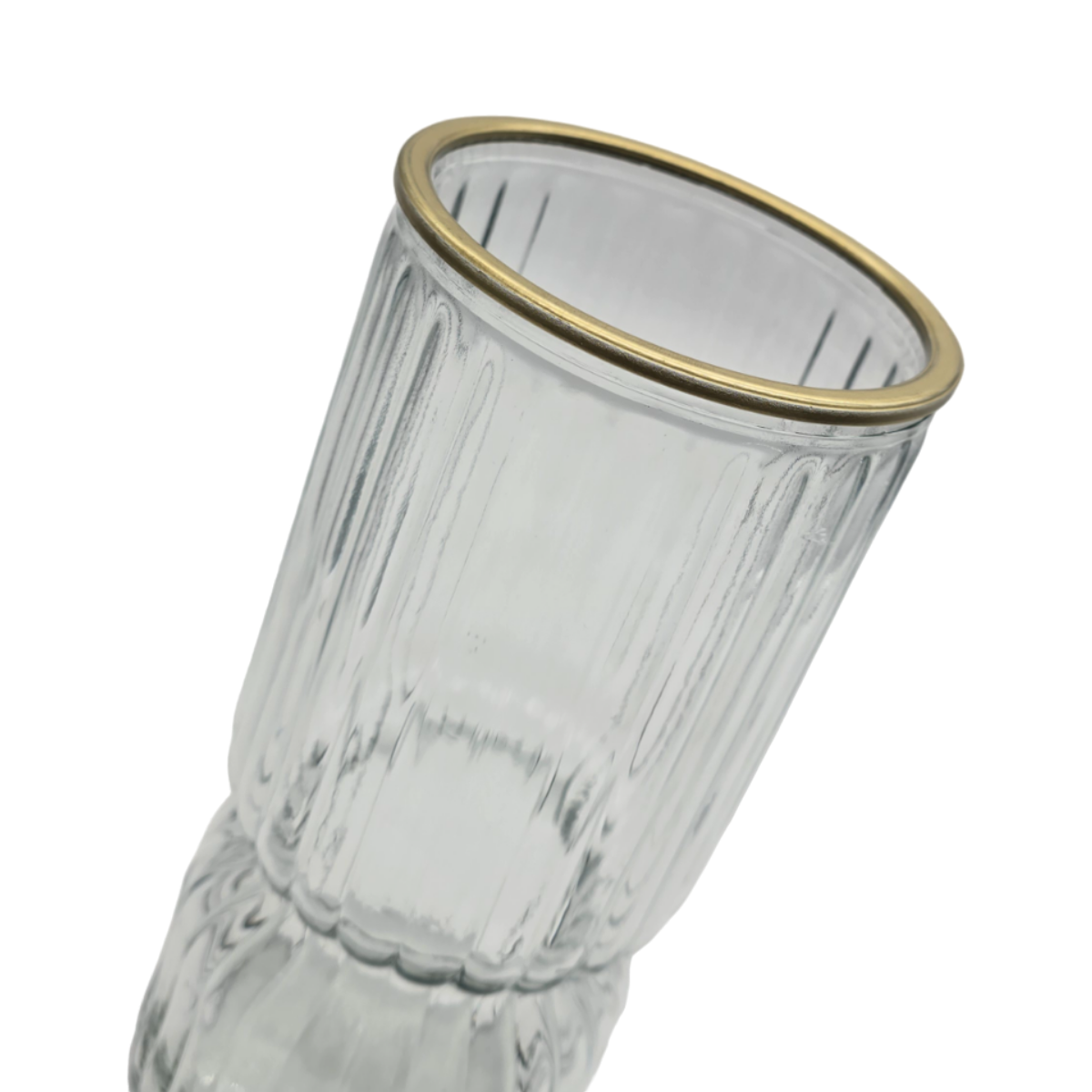 Este florero de vidrio con diseño de borde dorado es perfecto para cualquier decoración. Su elegancia y sofisticación son ideales para exhibir flores en cualquier espacio.
