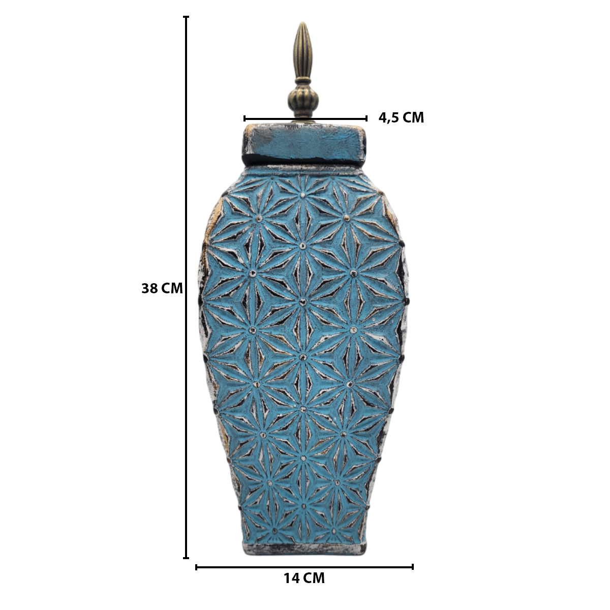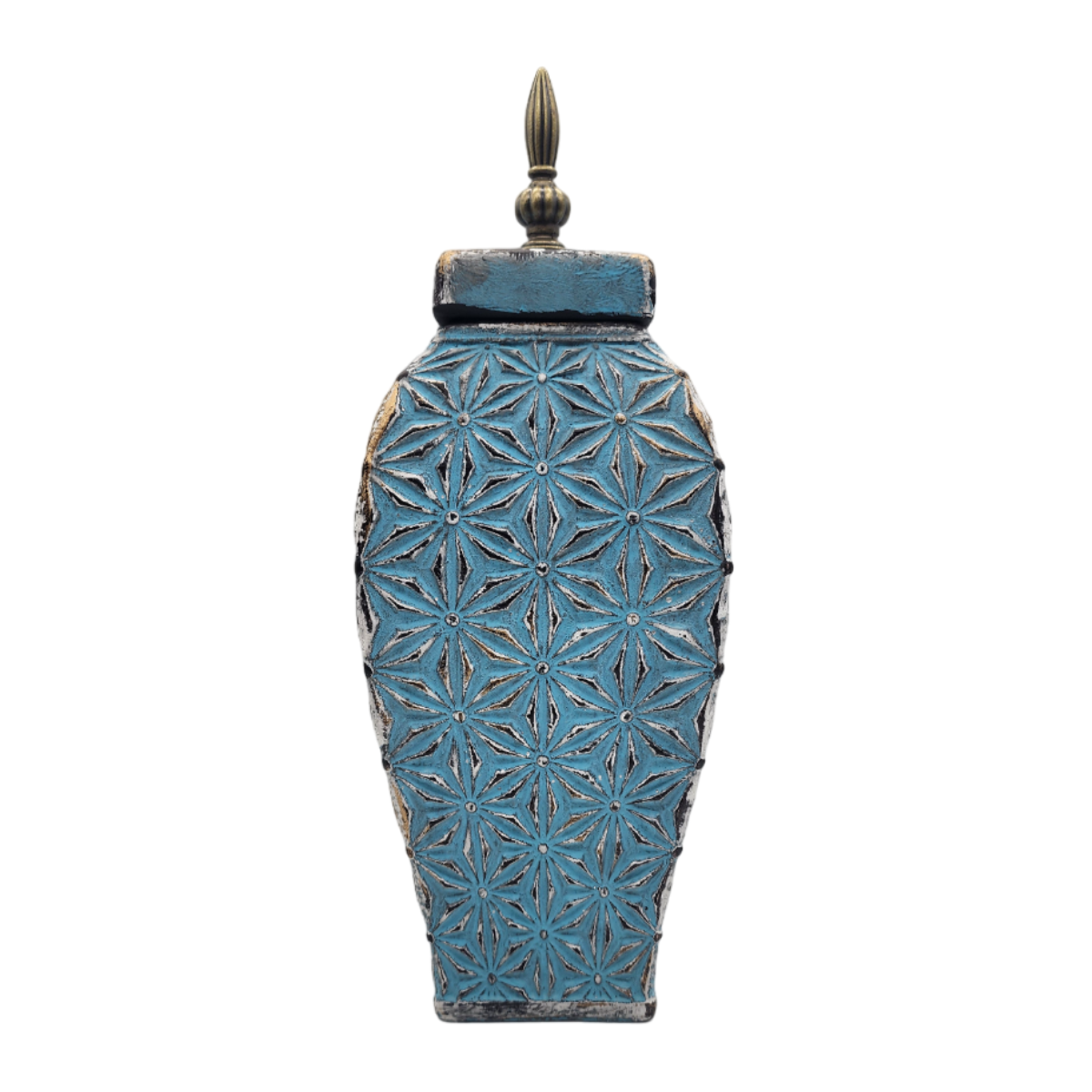 Este jarrón alargado, con su acabado azul envejecido, evoca un estilo antiguo y elegante. Fabricado con cerámica de alta calidad, su diseño detallado y textura única lo convierten en una pieza decorativa impresionante.