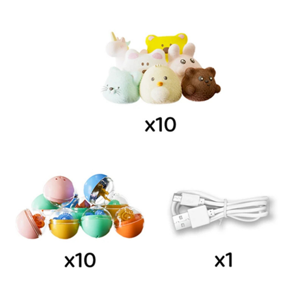 Incluye peluches y esferas sorpresa para atrapar con la garra, ofreciendo una experiencia similar a las clásicas máquinas de premios.