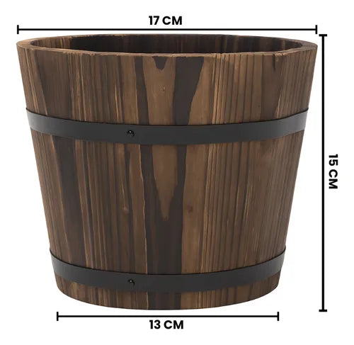 Decora con un estilo natural este macetero de madera compacto. El diseño tipo barril es perfecto para plantas pequeñas.