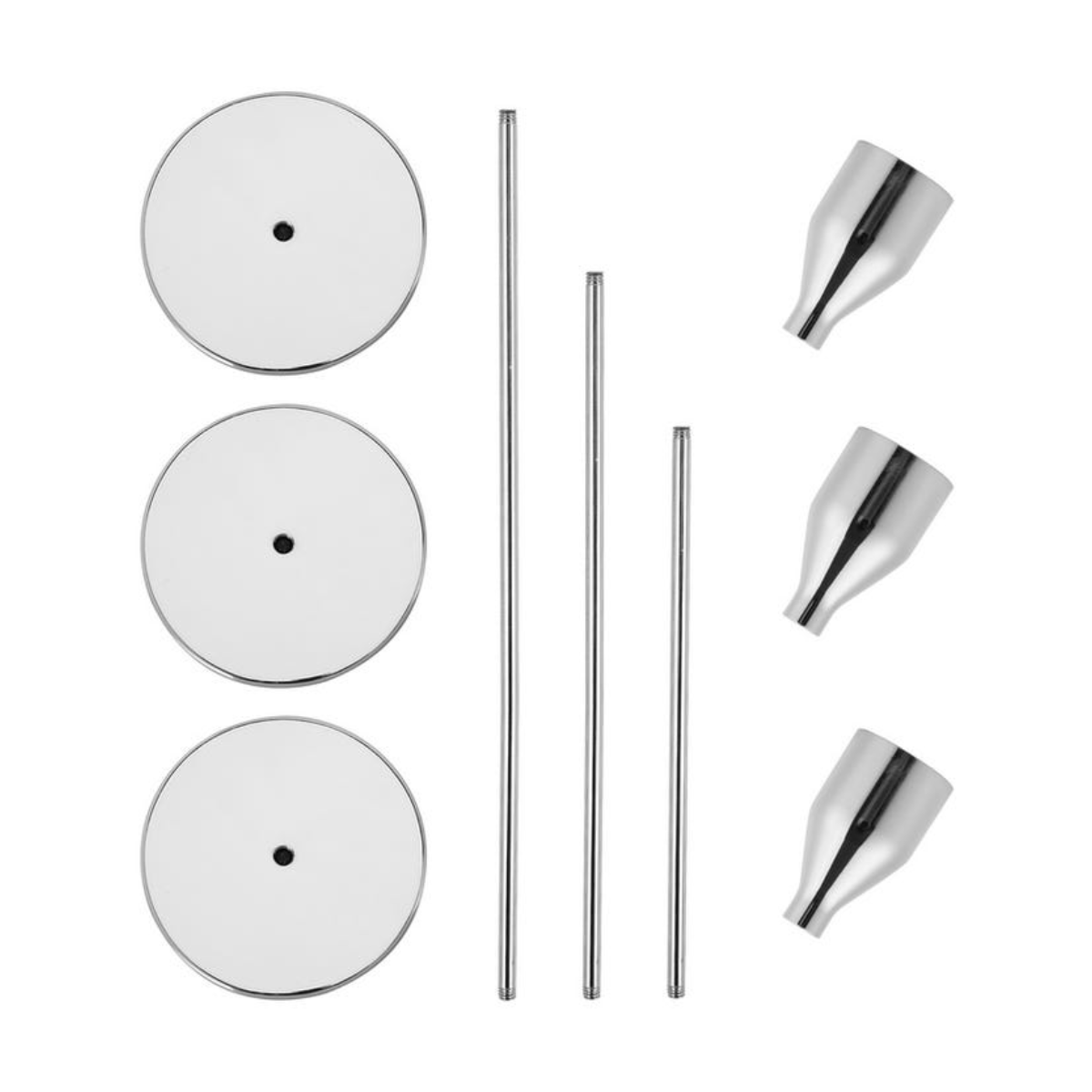Este set de 3 candelabros plateados es perfecto para darle un aire moderno y chic a tu mesa. Colocados en el centro de mesa, no solo brindan luz, sino también un diseño atractivo que realza cualquier tipo de decoración. Su acabado plateado hace que resalten en cualquier ambiente, creando un foco de atención sin ser demasiado intrusivos.