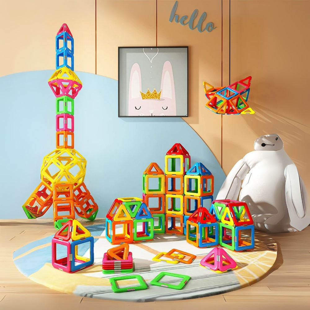 Este set de 118 piezas magnéticas es perfecto para que los niños desarrollen su imaginación y creatividad construyendo figuras, casas y estructuras coloridas.